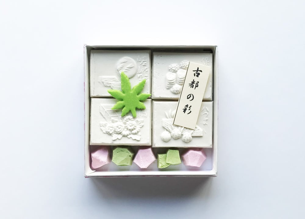 千年の王城、山紫水明の都、京の姿を「保津川」「重陽」「八つはし」「一と声」「嵯峨野」の五つの色紙にうつし「古都の彩」と名付けました。和三盆糖の美味しさと共に、京菓子としての意匠の美しさをお楽しみいただける若狭屋久茂の代表銘菓です。